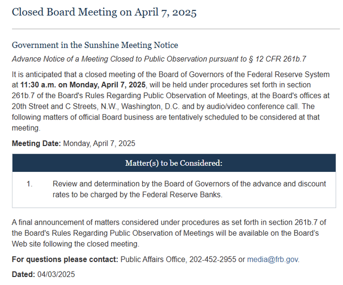 美联储将于美国东部时间4月7日举行闭门会议。