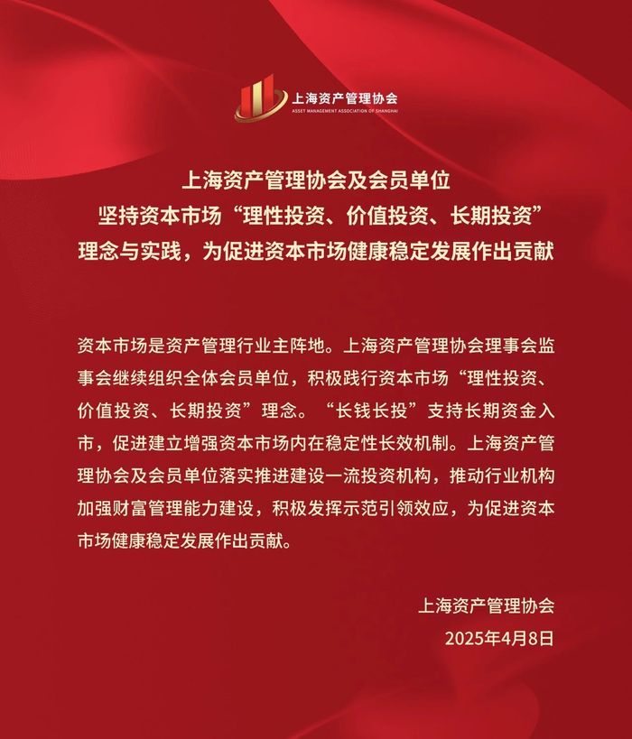 4月8日,上海资产管理协会表示,协会理事会监事会继续组织全体会员单位,积极践行资本市场“理性投资、价值投资、长期投资”理念。“长钱长投”支持长期资金入市,促进建立增强资本市场内在稳定性长效机制。协会及会员单位落实推进建设一流投资机构,推动行业机构加强财富管理能力建设,积极发挥示范引领效应,为促进资本市场健康稳定发展作出贡献。