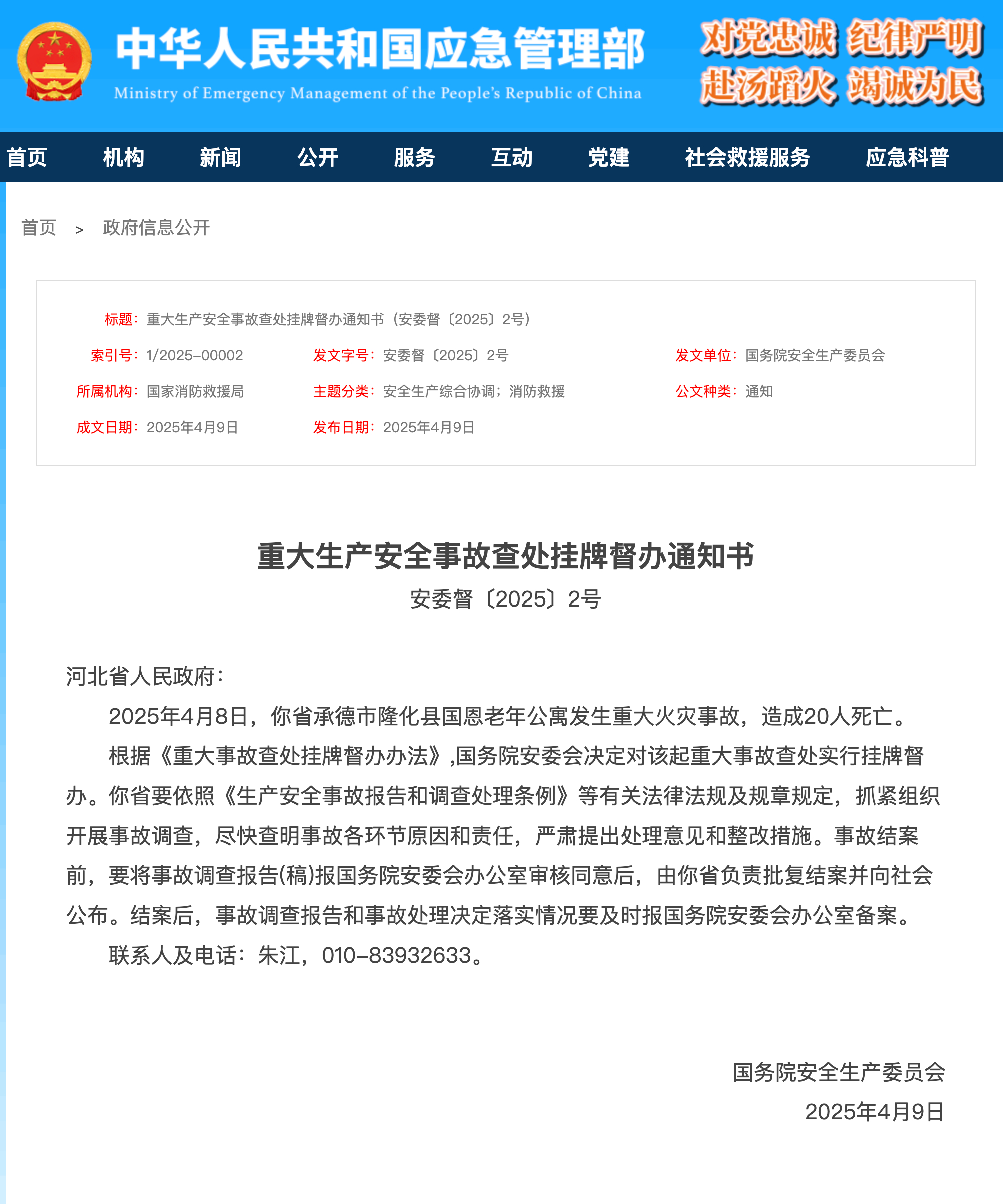 据界面,4月9日,国务院安全生产委员会发布向河北省人民政府发布重大生产安全事故查处挂牌督办通知书。通知书称,2025年4月8日,河北省承德市隆化县国恩老年公寓发生重大火灾事故,造成20人死亡。根据《重大事故查处挂牌督办办法》,国务院安委会决定对该起重大事故查处实行挂牌督办。