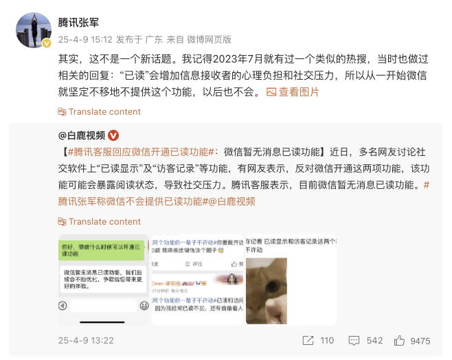 4月9日下午,腾讯公司公关总监张军在微博发文称,“‘已读’会增加信息接收者的心理负担和社交压力,所以从一开始微信就坚定不移地不提供这个功能,以后也不会。”