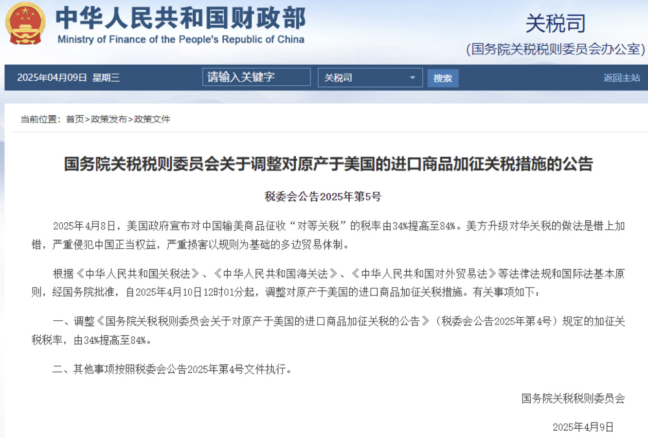 国务院关税税则委员会今天发布公告,自4月10日12时01分起,调整《国务院关税税则委员会关于对原产于美国的进口商品加征关税的公告》(税委会公告2025年第4号)规定的加征关税税率,原产于美国的所有进口商品的加征关税税率由34%提高至84%。