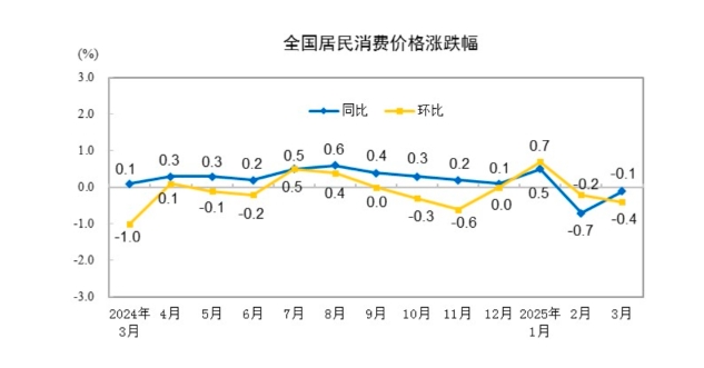 2025年3月份居民消费价格同比下降0.1%。