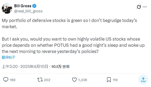 据新浪,当地时间周三,美国总统特朗普宣布将对部分国家暂停实施对等关税,为期90天,美股随即转涨。但老“债王”比尔·格罗斯在X上发帖称:“我想问问你们,你愿意持有这样高度波动的美国股票吗?这些股票的价格取决于美国总统晚上是否睡得好,第二天早上醒来是否会改变昨天的政策?”