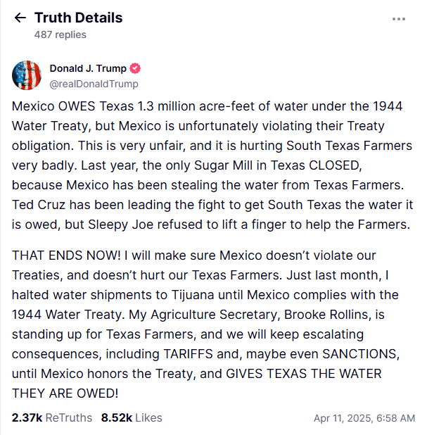 据界面,当地时间4月10日,美国总统特朗普在社交平台“真实社交”上发文指责墨西哥违反两国1944年签署的条约,窃取得克萨斯州农民的水资源。特朗普称,将“将不断升级后果,包括关税,甚至可能是制裁,直到墨西哥履行条约,给得克萨斯州他们应得的水!”
