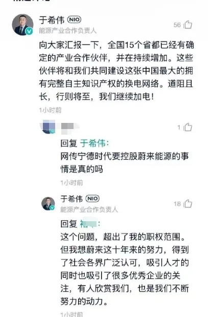九派财经获悉,4月9日中午,蔚来能源产业合作负责人于希伟在蔚来APP回应用户有关上述收购传闻时表示,“这个问题超出了我的职权范围。但我想蔚来这十年来的努力,得到了社会各界广泛认可,吸引人才的同时也吸引了很多优秀企业的关注,有人欣赏我们,也是我们不断努力的动力。”