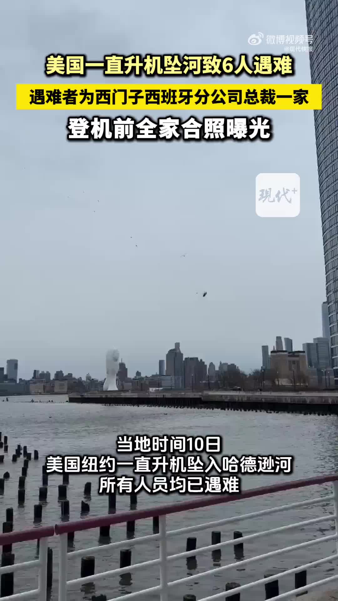 当地时间10日,美国纽约一直升机坠入哈德逊河,所有人员均已遇难。机上人员包括飞行员和西门子西班牙分公司总裁一家五口,包括他的妻子以及三名子女。根据直升机公司公布的照片显示,五名成员身穿厚衣,并在直升机前开心地合影, 没想到却成为生前最后的照片。(via 现代快报)
