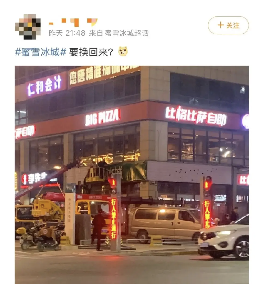 有网友晒出了该蜜雪冰城门店夜间更换招牌的照片。
