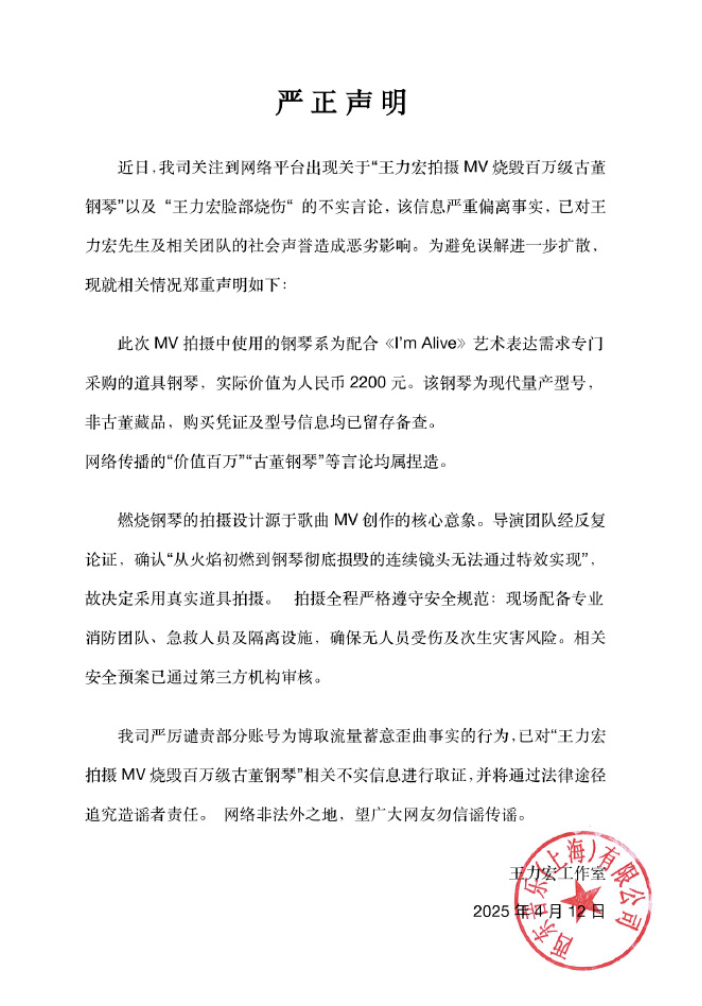 据橙柿互动,4月12日,王力宏工作室发严正声明,否认拍摄MV烧毁百万级古董钢琴、王力宏脸部烧伤等不实言论,还晒出了二手钢琴购买记录,价值2200元。