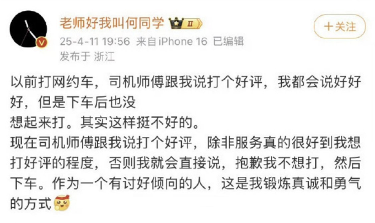 据九派新闻报道,4月12日,互联网博主“何同学”微博上发布的网约车相关言论引发关注。据悉,11日晚,互联网博“老师好我叫何同学”在社交媒体分享自己处理网约车司机索要好评的经历引发争议。他提到,过去面对司机的好评请求会口头答应但事后遗忘,如今改为直接拒绝,并称这是克服“讨好型人格”的锻炼方式。