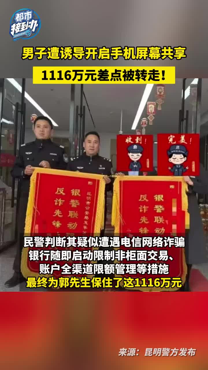 近日,云南昆明的郭先生接到一通陌生电话,对方声称其开通了平台会员,不关闭每月将自动扣费。在对方的诱导下,郭先生下载了一款APP并开启了屏幕共享,银行卡里的1116万元险被转走。民警判断其疑似遭遇电信网络诈骗,银行随即启动限制非柜面交易、账户全渠道限额管理等措施。事后,郭先生送来锦旗和感谢信,感谢民警及银行工作人员为其保住了财产。 (via 都市报道)
