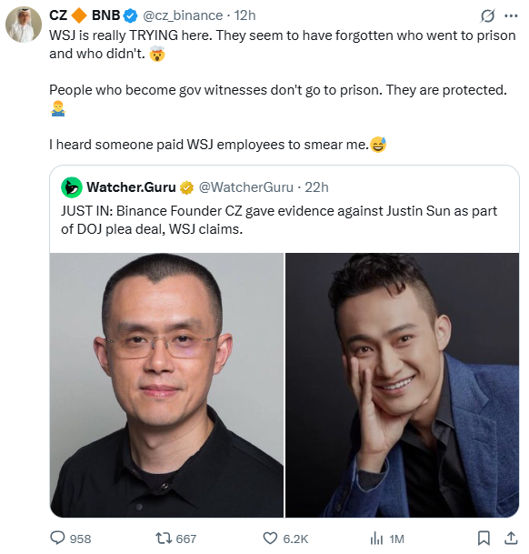 CZ(赵长鹏):听说有人付钱给《华尔街日报》员工来抹黑我。