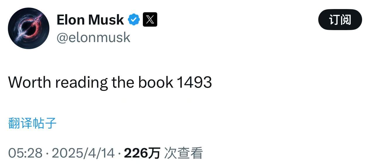埃隆・马斯克在社交平台发文,推荐阅读《1493》这本书。该书探讨了哥伦布远航对全球的影响,尤其关注“哥伦布大交换”。书中详细描述了植物、动物、疾病和思想如何在各大洲之间传播,最终塑造了现代全球化。书中展现了始于1493年的这些交流如何造就了当今互联互通的世界,并对文化和环境产生了持久的影响。