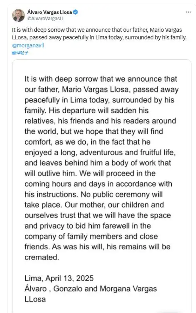 略萨的儿子阿尔瓦罗·巴尔加斯·略萨在社交媒体X上分享的家庭声明中表示:“我们怀着沉重的心情宣布,我们的父亲马里奥·巴尔加斯·略萨今天在利马安详去世,身边陪伴着家人。”这位作家的三个孩子补充说,不会举行公众仪式,但他们将进行家庭告别。