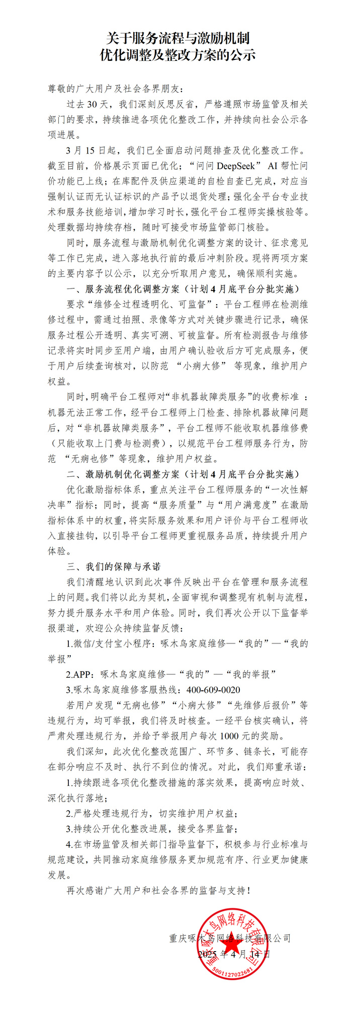 4月14日,啄木鸟家庭维修发布关于服务流程与激励机制优化调整及整改方案的公示。啄木鸟表示,3月15日起,公司已全面启动问题排查及优化整改工作。现将两项方案的主要内容予以公示,以充分听取用户意见,确保顺利实施⬇️