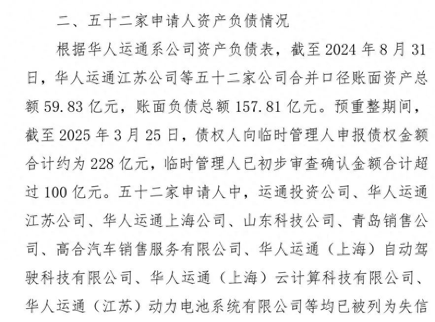 在资产和负债情况方面,华人运通系五十二家公司合并口径账面资产总额为59.83亿元,账面负债157.81亿元。同时,在预重整期间,债权人申报债权金额合计约228亿元,临时管理人已初步审查确认的债权金额合计超过100亿元。