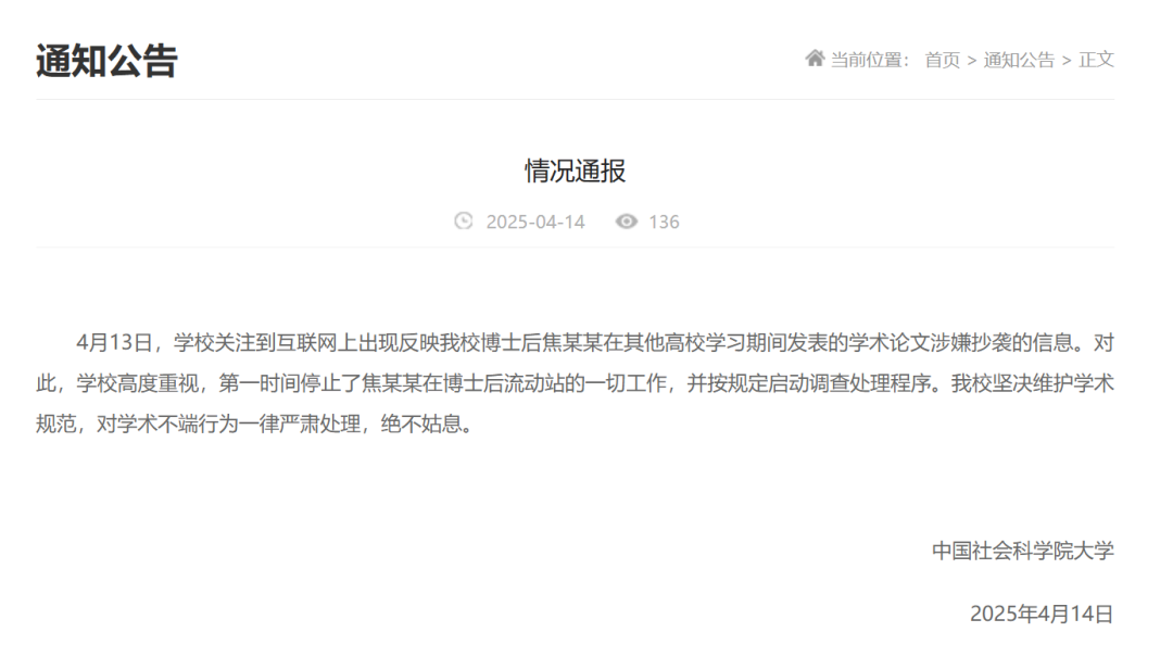 中国社会科学院大学通报:第一时间停止博士后焦某某一切工作。