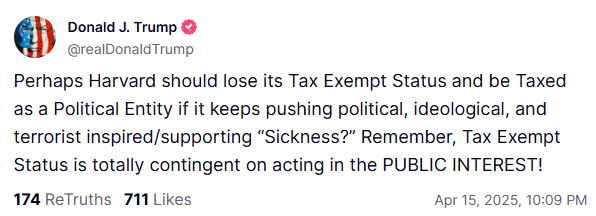 据界面,当地时间4月15日,美国总统特朗普在社交平台“真实社交”发文称,也许哈佛应该失去免税地位,免税地位取决于公共利益。或许应该将哈佛大学作为政治实体征税。