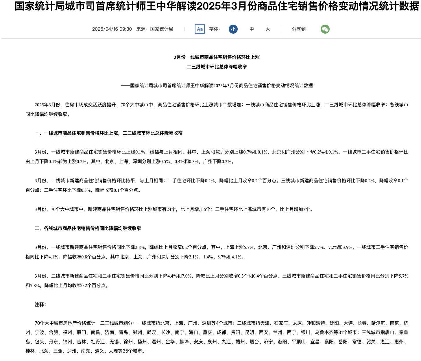 4月16日消息,国家统计局城市司首席统计师王中华解读2025年3月份商品住宅销售价格变动情况统计数据。