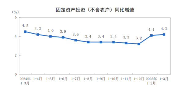 国家统计局:2025年1-3月份全国固定资产投资增长4.2%。