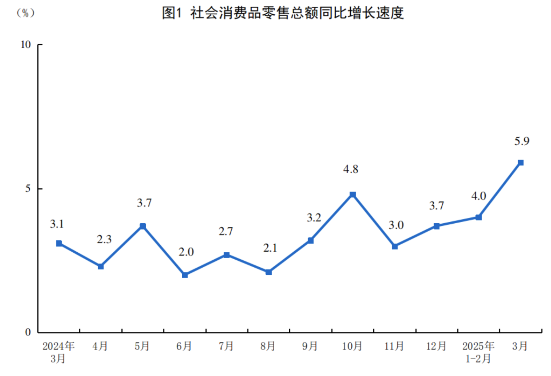 国家统计局:3月份社会消费品零售总额40940亿元,同比增长5.9%。