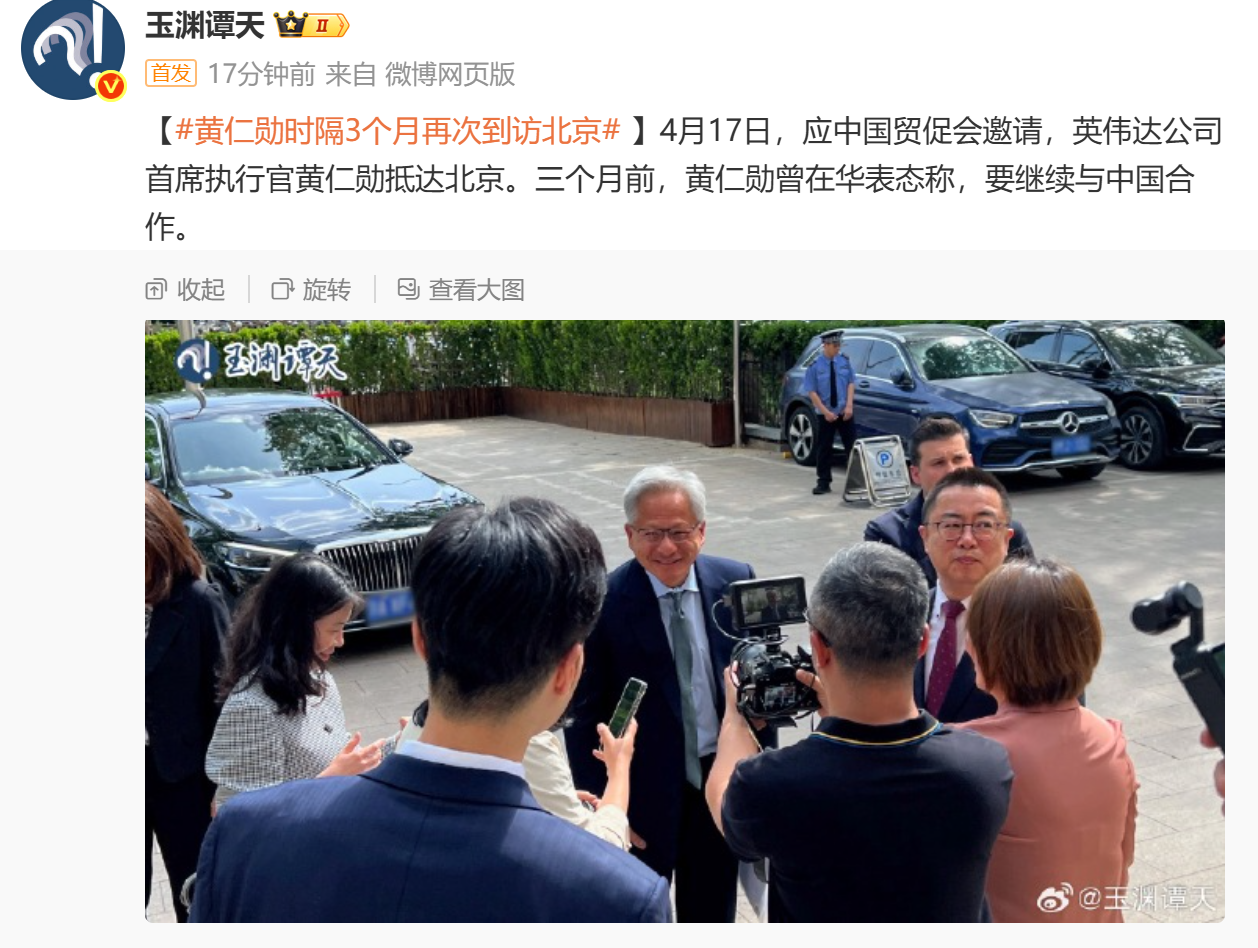 据玉渊潭天,4月17日,应中国贸促会邀请,英伟达公司首席执行官黄仁勋抵达北京。三个月前,黄仁勋曾在华表态称,要继续与中国合作。