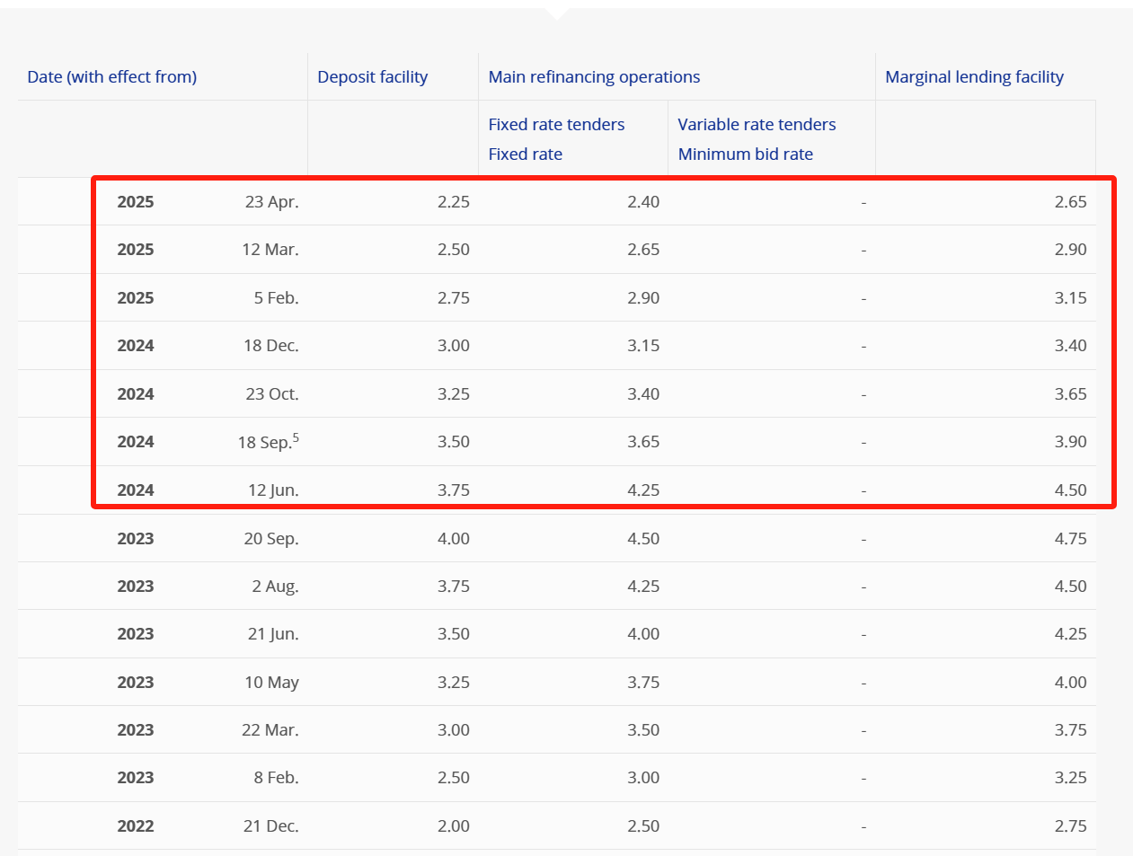 欧洲央行将三大关键利率下调25个基点。欧洲央行将存款利率下调至2.25%,将边际贷款利率下调至2.65%,将主要再融资利率下调至2.40%,均符合市场预期。这是该行自去年6月宣布降息以来第7次下调利率。