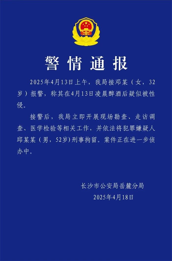 据界面,4月18日,长沙市公安局岳麓分局发布警情通报:2025年4月13日上午,我局接邓某(女,32岁)报警,称其在4月13日凌晨醉酒后疑似被性侵。接警后,我局立即开展现场勘查、走访调查、医学检验等相关工作,并依法将犯罪嫌疑人邱某某(男,52岁)刑事拘留。案件正在进一步侦办中。