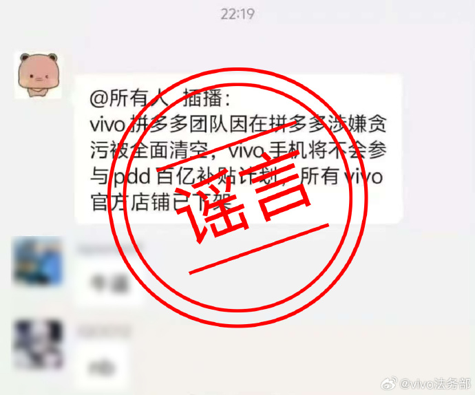 对此,4月21日,vivo法务部在其官方微博进行了回应,将前述网传消息定为“造谣”。vivo法务部称,其留意到部分网传不实内容,对vivo的经营活动进行造谣和抹黑,已严重损害用户利益和vivo品牌声誉。