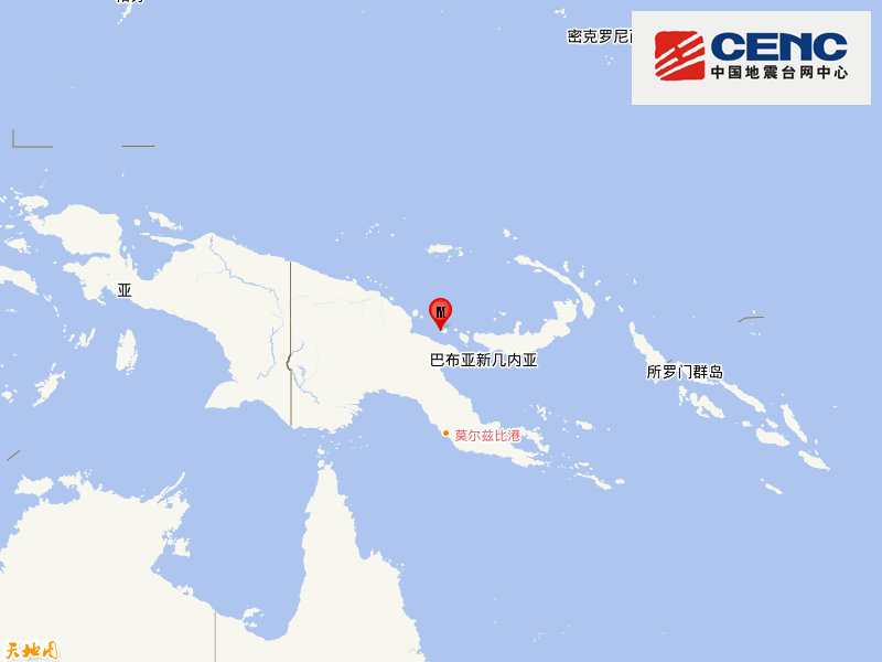 巴布亚新几内亚附近海域发生5.7级地震,震源深度200千米。