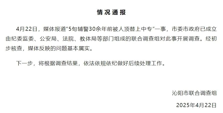 4月22日,媒体报道“5旬辅警30余年前被人顶替上中专”一事,市委市政府已成立由纪委监委、公安局、法院、教体局等部门组成的联合调查组对此事开展调查。经初步核查,媒体反映的问题基本属实。下一步,将根据调查结果,依法依规依纪做好后续处理工作。