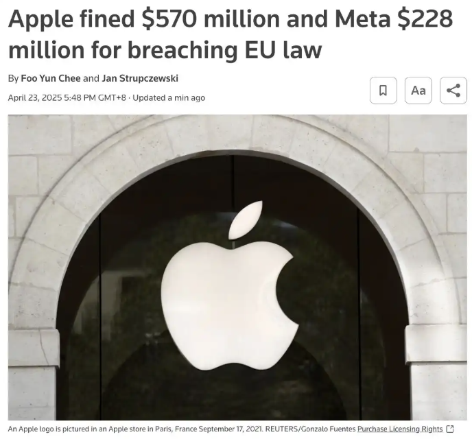 欧洲《数字市场法案》首个制裁落地:苹果、Meta分别被罚5亿和2亿欧元。