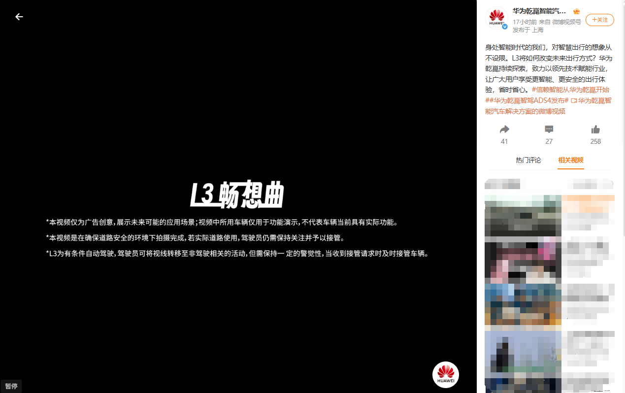 在宣传片的片头,华为方面表示,“本视频仅为广告创意”“不代表车辆当前具有实际功能”“若实际道路使用,驾驶员仍需保持关注并予以接管”。