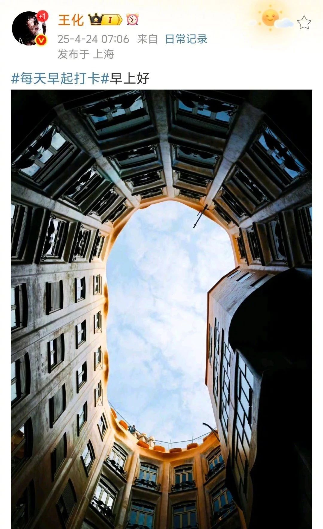 据新黄河,今日早间,小米集团公关部总经理@王化 在微博发布一张西班牙巴塞罗那米拉之家图片,但拍摄角度颇有几分“坐井观天”的感觉。