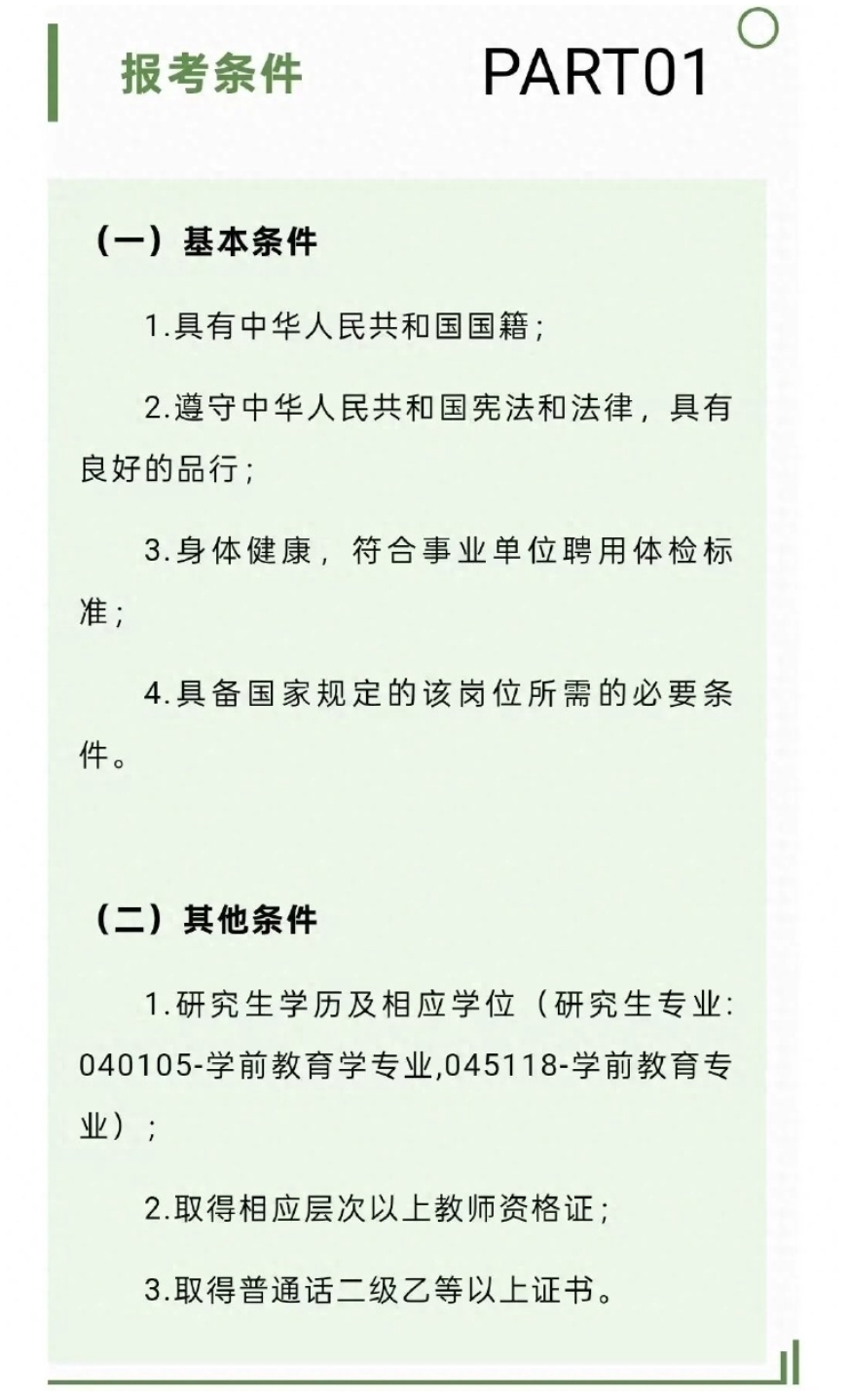 重庆市人力资源和社会保障局官网的《重庆市区县事业单位(含两江新区)2025年上半年公开招聘工作人员岗位一览表》显示,重庆市市区县事业单位2025年上半年公开招聘的学前教育岗共来自七个招聘单位,其中江北区的四所幼儿园均要求学前教育专业的研究生学历,同时需要取得相应层次及以上的教师资格证;取得普通话二级乙等以上证书。