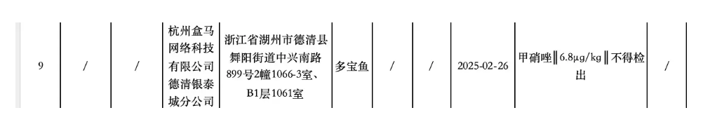 不合格项目说明中写明,被抽检名单为杭州盒马网络科技有限公司德清银泰城分公司,地址为盒马鲜生(德清银泰城店),生产日期为2025年2月26日的多宝鱼,不合格原因为检测出甲硝唑。