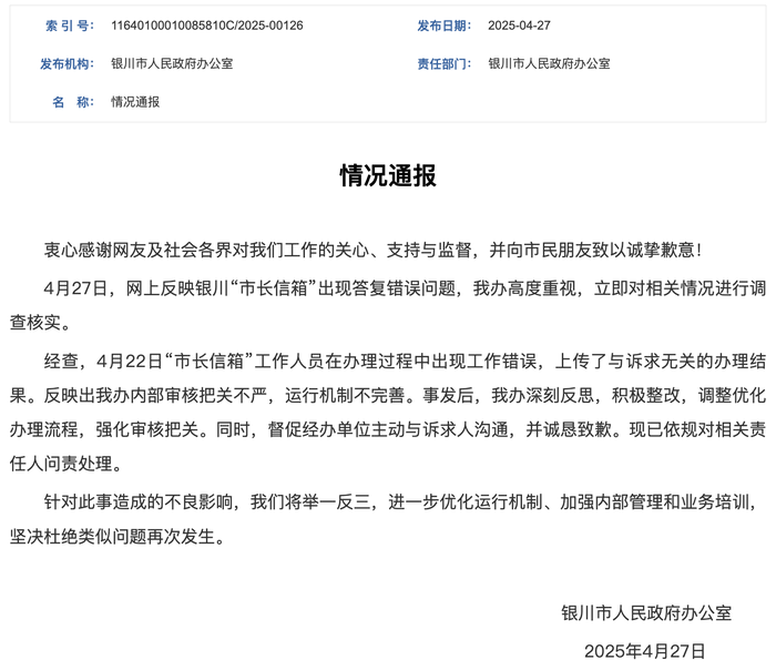 据界面,宁夏银川市人民政府办公室就网传银川市长信箱被指“已读乱回”发布情况通报:4月27日,网上反映银川“市长信箱”出现答复错误问题,我办高度重视,立即对相关情况进行调查核实。经查,4月22日“市长信箱”工作人员在办理过程中出现工作错误,上传了与诉求无关的办理结果。反映出我办内部审核把关不严,运行机制不完善。事发后,我办深刻反思,积极整改,调整优化办理流程,强化审核把关。同时,督促经办单位主动与诉求人沟通,并诚恳致歉。现已依规对相关责任人问责处理。