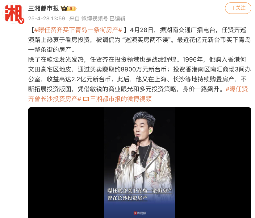 据三湘都市报,4月28日,据湖南交通广播电台,任贤齐巡演路上热衷于看房投资,被调侃为 “巡演买房两不误”。最近花亿元新台币买下青岛一整条街的房产。