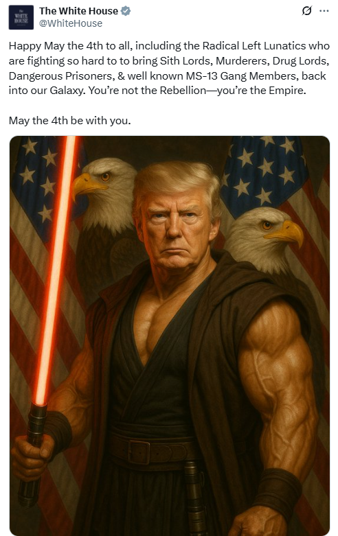 美国白宫和马斯克同日在社交媒体上发图时均配文:“愿5月4日与你同在(愿原力与你同在)。”但两人手持的红色光剑。代表着电影中的邪恶势力,引发网友热议。有美国网友对此吐槽:“怎么就没有一个懂行的员工来告诉你们哪种颜色的光剑代表着好、哪种颜色的光剑代表着坏?”“从字面上承认他正在为黑暗势力而战……”