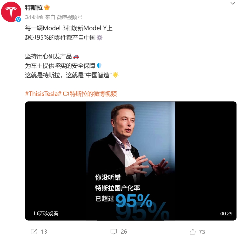 特斯拉官宣:Model 3和焕新Model Y超95%零件来自国内。