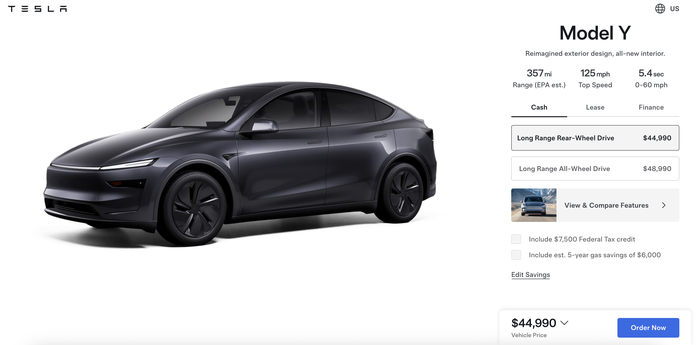 据界面,特斯拉官网显示,特斯拉已在美国推出长续航后轮驱动版Model Y,售价为44990美元。