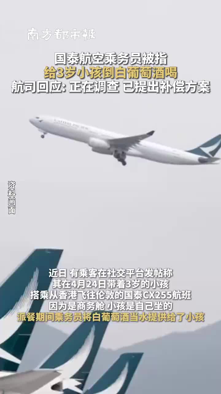 国泰乘务员被诉将白葡萄酒给3岁小孩喝,航司回应:正在调查,已提出补偿方案。