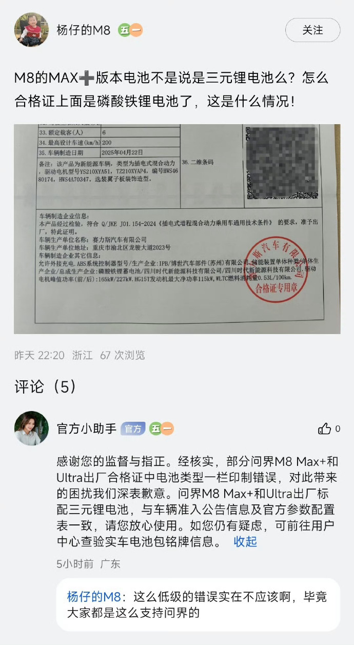 此前有车主在问界APP上发文质疑称:“问界M8的MAX+版本电池不是说是三元锂电池么?怎么合格证上面是磷酸铁锂电池了,这是什么情况!”