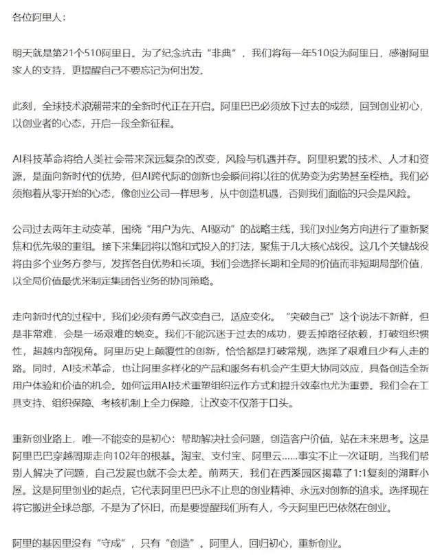 据“三言科技”文章称,今天,阿里巴巴集团CEO吴泳铭在内网发帖,呼吁阿里人“回归初心、重新创业”。他写道,“我们必须抱着从零开始的心态,像创业公司一样思考,从中创造机遇,否则我们面临的只会是风险。”