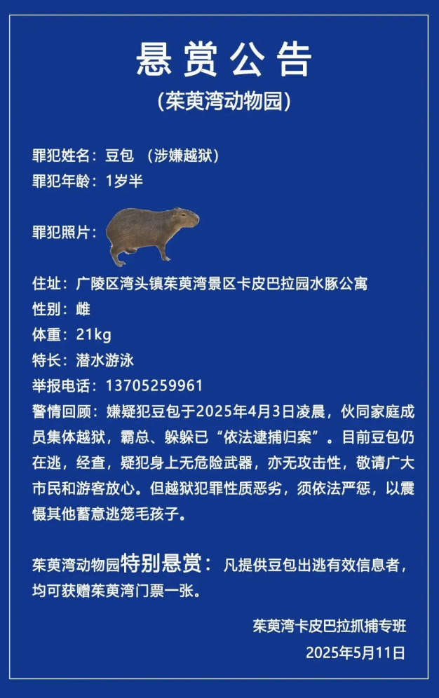 据澎湃,5月11日上午,江苏省扬州市茱萸湾风景区管理处在其官方微信公众号发布一则悬赏公告,称茱萸湾动物园的卡皮巴拉豆包于2025年4月3日出逃,至今已达40天。