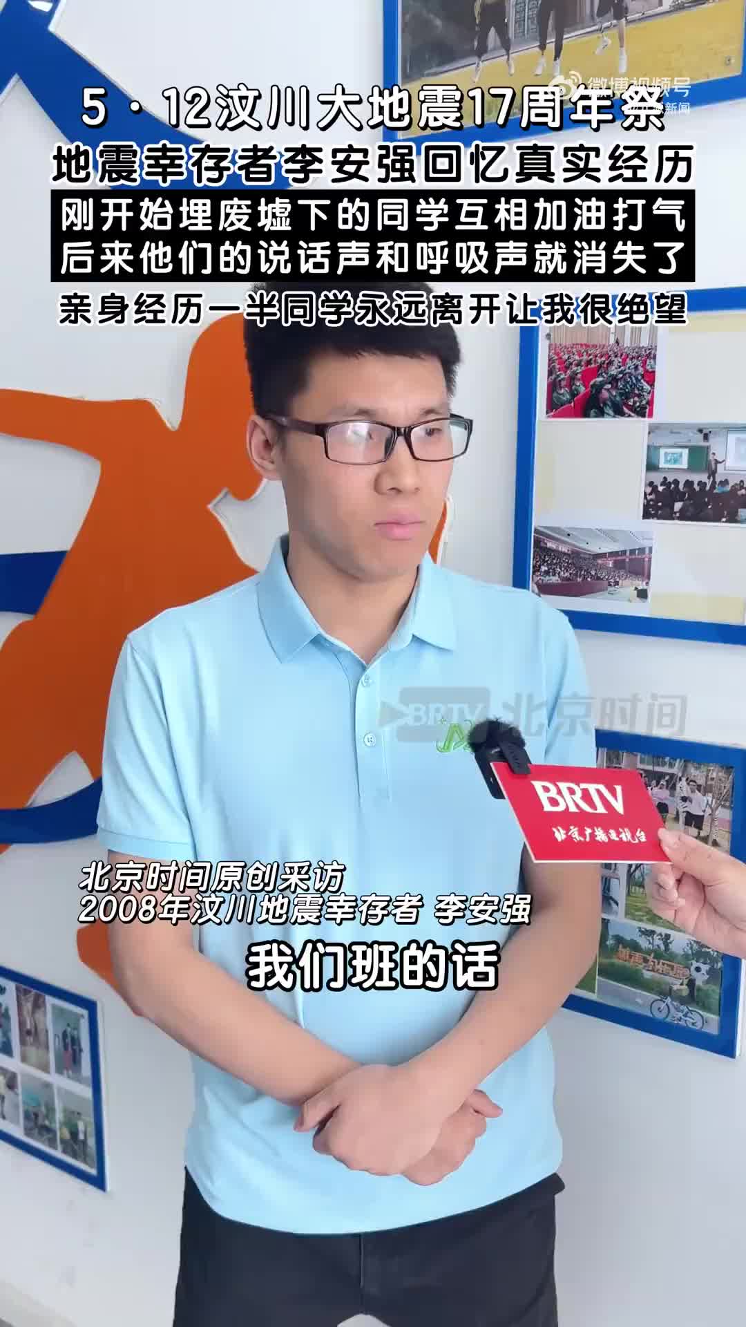 2025年5月12日,汶川大地震17周年祭,李安强向记者回忆真实经历,“我们班有将近一半的同学永远的离开了。”他表示,地震时正在上下午第一节课,刚上课没多久,就感觉整个教学楼在剧烈摇晃,大概十几秒后,整个教学楼就垮塌了,“差不多被埋30个小时,刚开始同学们互相加油打气,后来他们的说话声和呼吸声就消失了。”(via 北京时间)
