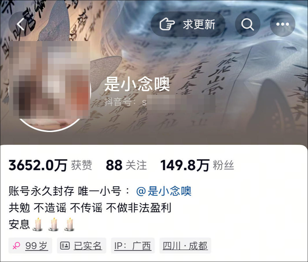 5月11日凌晨4点23分,抖音账号“@是小念噢”发布视频称,该账号博主真名叫孙某,“已于2025年5月10日23点,在成都自杀去世,其账号已交由亲友管理。对于自杀细节,请大家不信谣、不传谣……”
