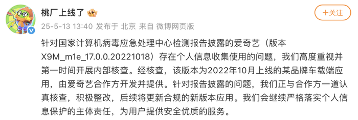 5月13日,爱奇艺公司官方发言人@桃厂上线了 发文称,针对国家计算机病毒应急处理中心检测报告披露的爱奇艺(版本X9M_m1e_17.0.0.20221018)存在个人信息收集使用的问题,公司高度重视并第一时间开展内部核查。经核查,该版本为2022年10月上线的某品牌车载端应用,由爱奇艺合作方开发并提供。针对报告披露的问题,公司正与合作方一道认真核查,积极整改,后续将更新合规的新版本应用。公司会继续严格落实个人信息保护的主体责任,为用户提供安全优质的服务。