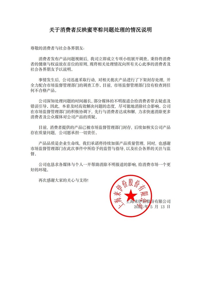 5月13日,来伊份发布关于消费者反映蜜枣粽问题处理的情况说明:事情发生后,公司迅速采取行动,对相关批次产品进行了下架封存处理,并全力配合市场监督管理部门的调查工作。目前,市场监督管理部门没有检查到任何不合格产品。公司在市场监督管理部门的积极协调下,先行与消费者达成和解,力求快速消除更多消费者及公众媒体对公司产品的质疑。目前,消费者提供的产品已被市场监督管理部门封存,后续如核实公司产品存在质量问题,公司愿承担一切责任。