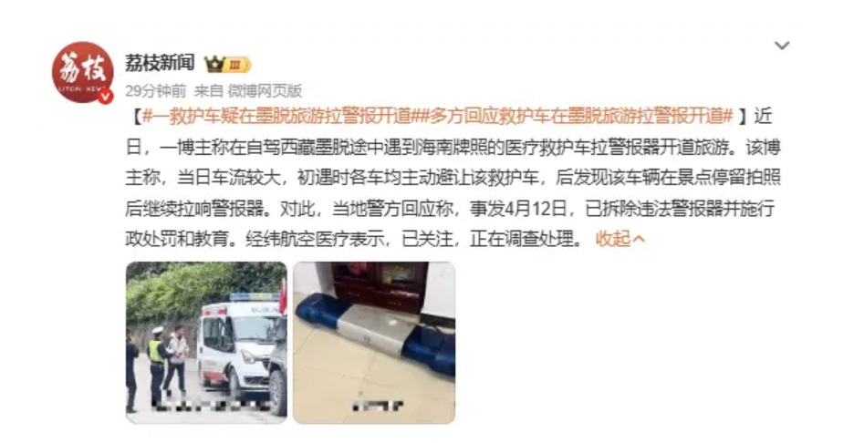 据荔枝新闻,近日,一博主称在自驾西藏墨脱途中遇到海南牌照的医疗救护车拉警报器开道旅游。该博主称,当日车流较大,初遇时各车均主动避让该救护车,后发现该车辆在景点停留拍照后继续拉响警报器。对此,当地警方回应称,事发4月12日,已拆除违法警报器并施行政处罚和教育。经纬航空医疗表示,已关注,正在调查处理。