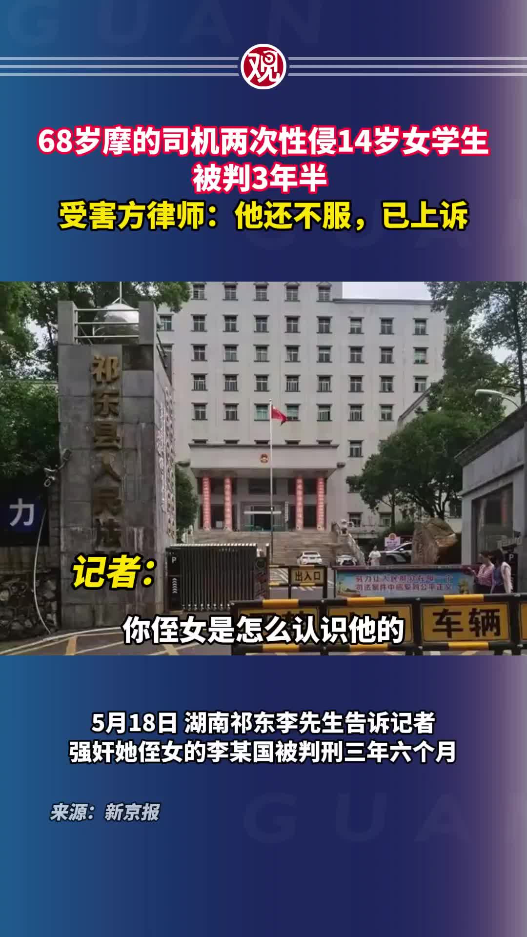 68岁摩的司机两次性侵14岁女学生,被判3年半,受害方律师:他还不服,已上诉。
